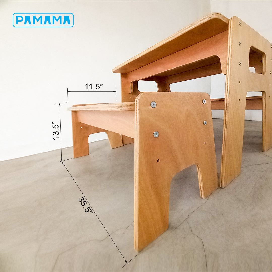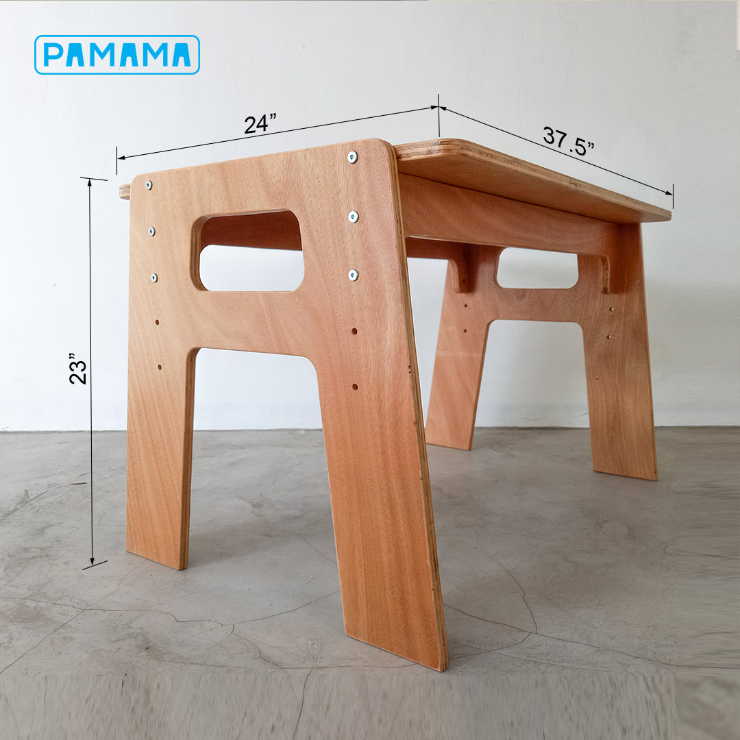 Each set includes a table and two benches. Table height and seat height can be adjusted for 4 up to adult years. Made with local made premium marine plywood and coated with child safe finishing material, the Sit & Share can be used for indoor and outdoor activities.